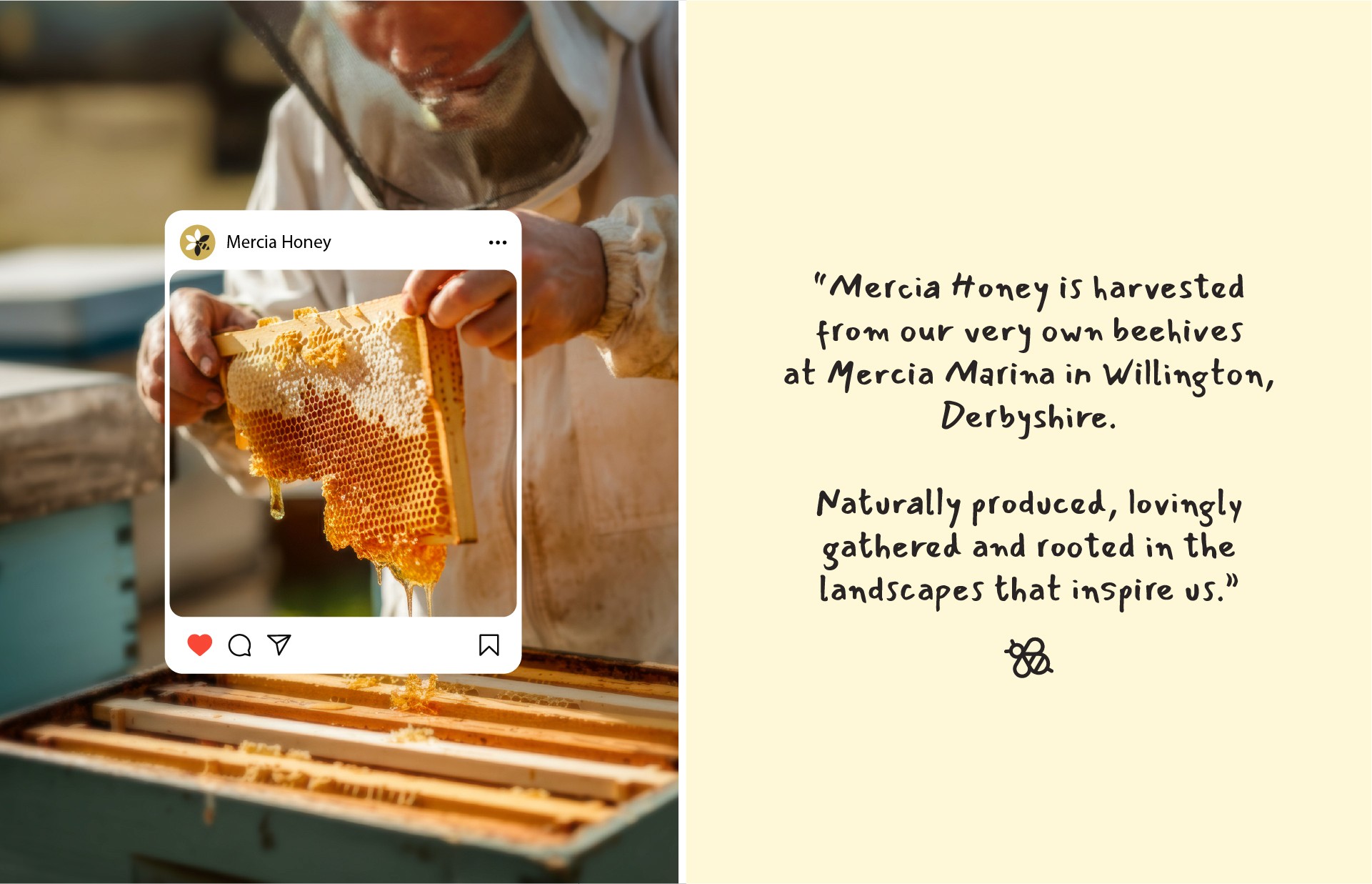 The final identity feels premium yet approachable, rooted in the natural beauty of Mercia Marina. Through thoughtful design, photography and messaging, Mercia Honey now presents itself as a meaningful, story-rich product with a clear sense of origin. The marina can confidently share their honey with visitors and the local community, supported by a cohesive brand that elevates its quality and purpose.