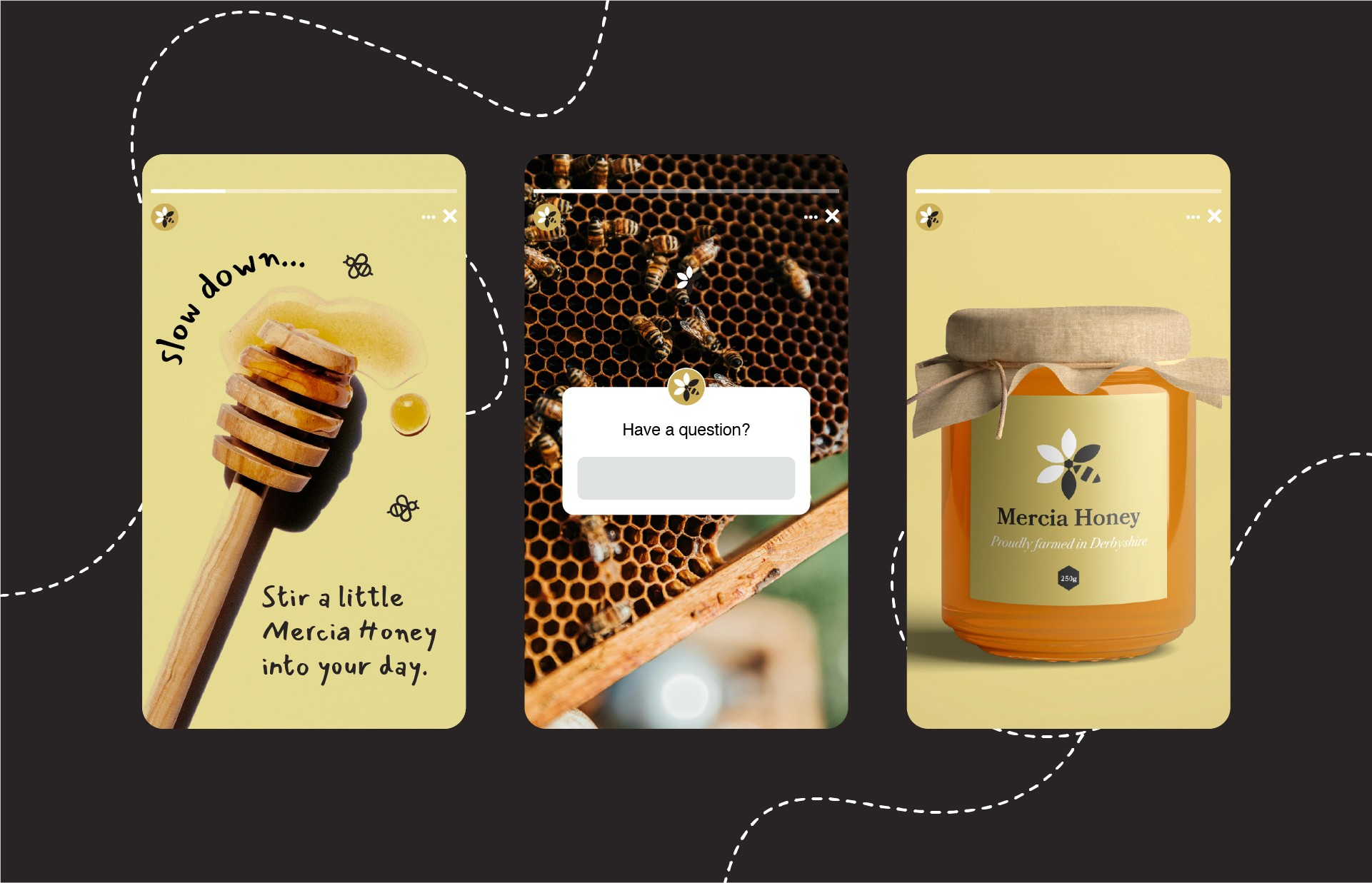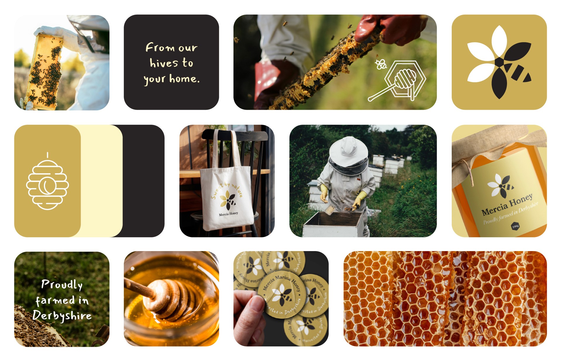 Mercia Marina approached us to create a brand identity for their locally harvested honey, produced from beehives situated on their marina grounds in Derbyshire. They wanted the product to feel authentic, natural and reflective of the calm, waterside environment that surrounds the hives. The challenge was to transform a high-quality but visually unbranded product into something with a clear story, strong presence and cohesive identity.We began by exploring the marina’s landscape, flora and community values, using these as inspiration for a warm, minimal and nature-led visual style. From there, we developed a modern logo, a soft honey-toned colour palette and clean packaging that highlights the purity of the product. Alongside this, we crafted a narrative and tone of voice centred on locality, sustainability and small-batch craftsmanship, ensuring the brand communicates its ethical production and strong connection to place.